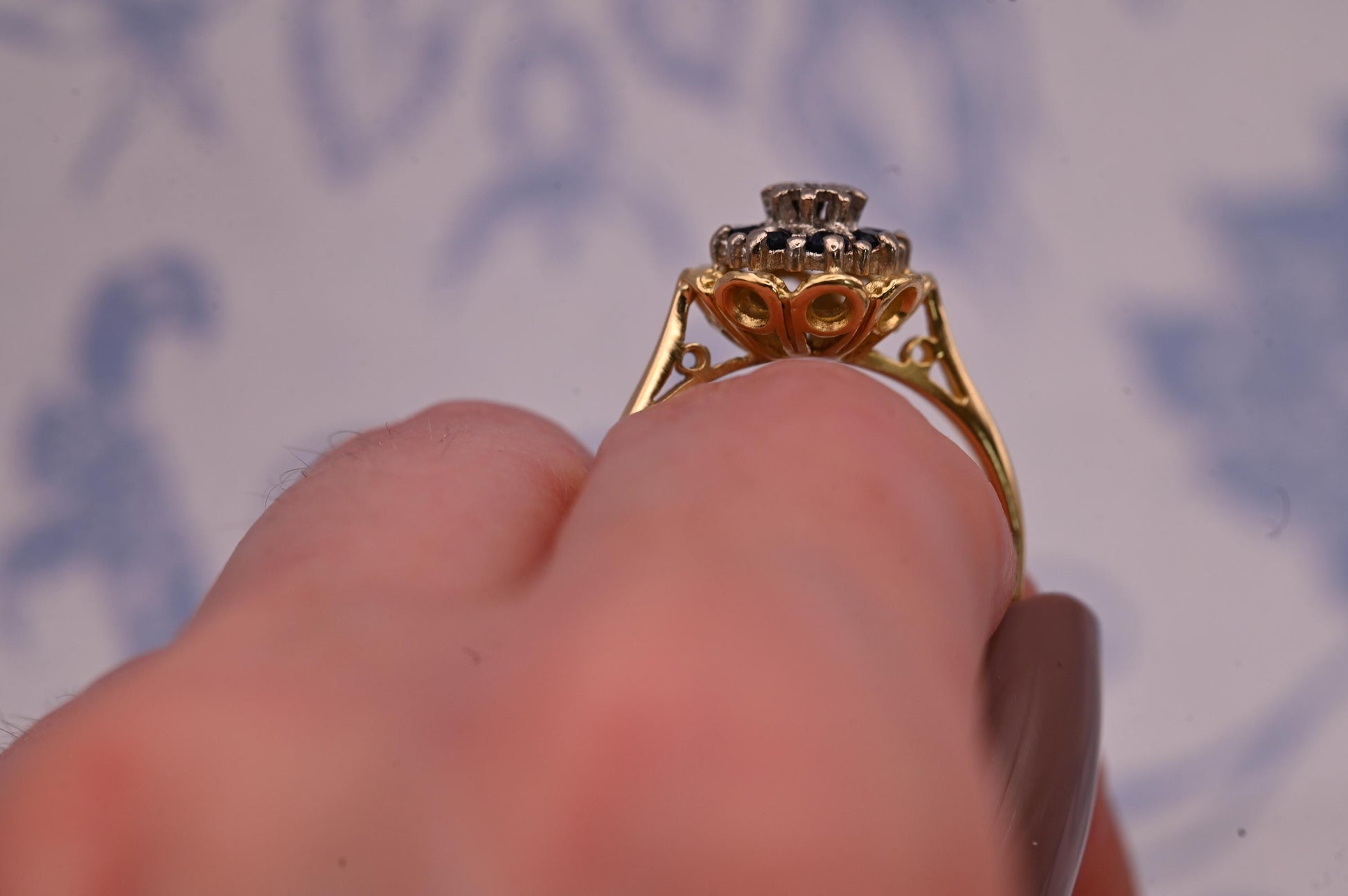 Vintage Mid-Century Sapphire and Diamond Ring, 18ct Yellow Gold Art Deco Floral Jewellery, Ornate Unique Heirloom Jewelry, Blue Dress Ring